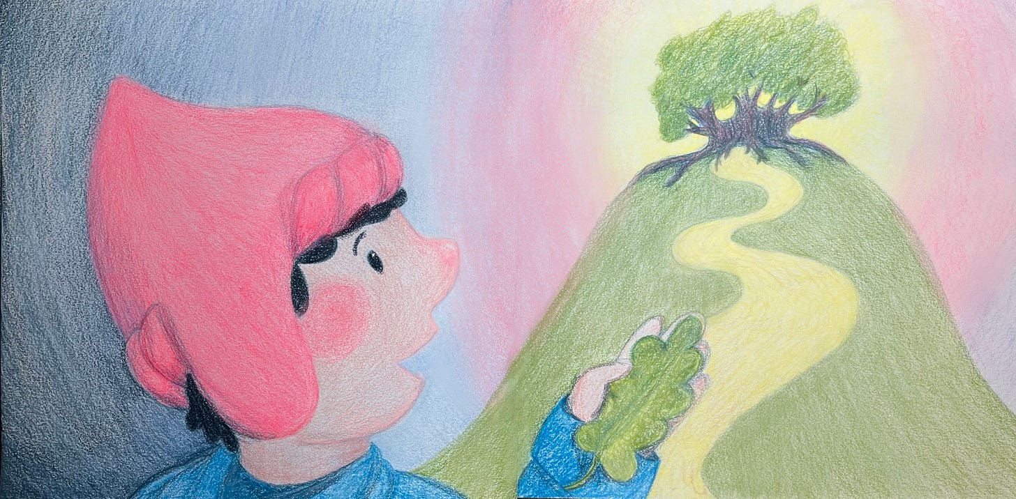 The trail of leaves led to the base of a hill on which stood a magnificent Oak tree - the Tree of Knowledge, enormous and glowing in a golden light.